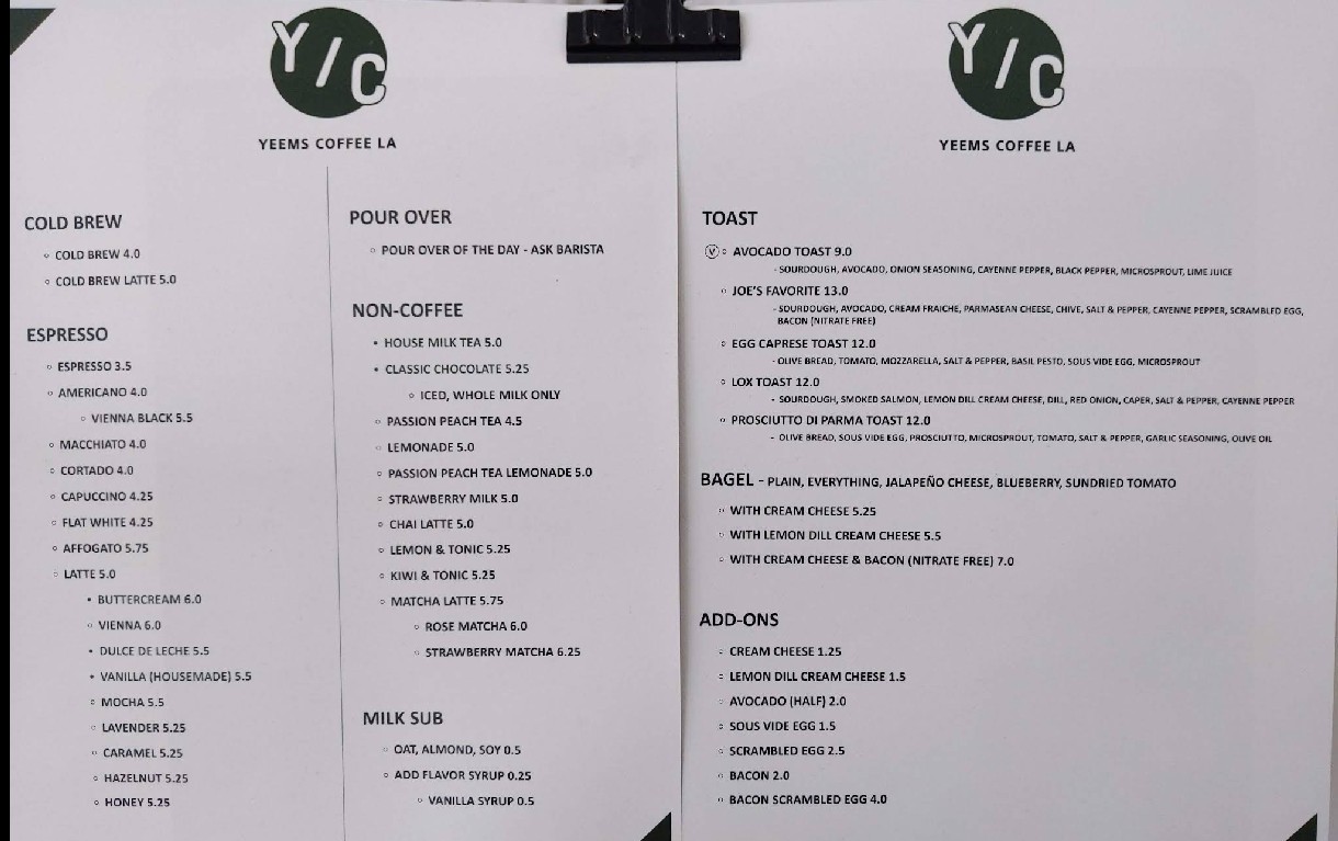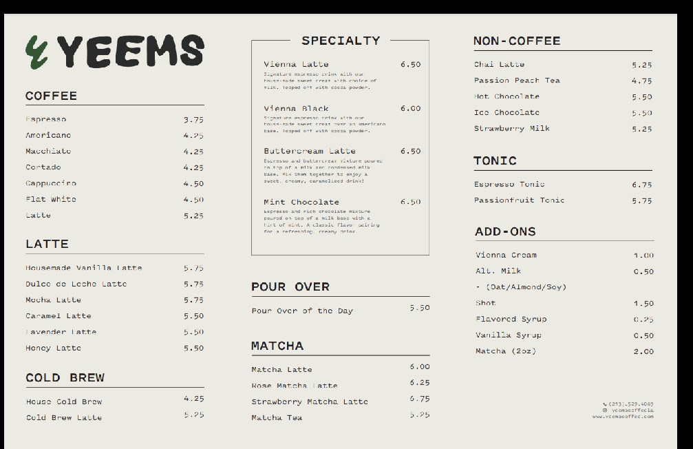 At Yeems Coffee, we pride ourselves on delivering an exceptional coffee experience. Whether you're looking for a quick caffeine fix or a relaxing environment to unwind, our cozy coffee shop in the heart of Los Angeles offers it all. With a wide range of freshly brewed coffee, espresso drinks, and delicious pastries, you can enjoy a memorable visit every time. Conveniently located in Zuniga’s Market, we are your go-to destination for quality coffee at affordable prices. Come in today and taste the difference!