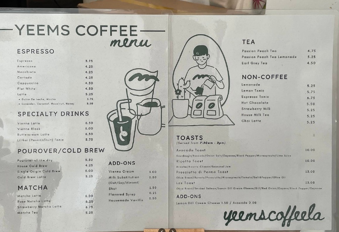 Yeems Coffee is open on Monday, Tuesday, Wednesday, Thursday, Friday and Saturday from 7:00 AM - 5:00 PM; Sunday from 8:00 AM - 5:00 PM.